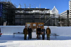 北部方面システム通信群(群長 小林 理1佐)は、第73回さっぽろ雪まつりにおいて3年ぶりとなる大雪像の制作に取り組みました。今年の大雪像は、すべての医療従事者に感謝を込めてフローレンス・ナイチンゲールの偉業を偲ぶエンブリー荘です。完成目前の令和5年1月29日(日)に、部隊側のご厚意により札幌所在の信友会会員に対する雪像見学会を開催していただきました。当日は天候にも恵まれ、参加した榊氏・一條氏・小林氏に対して小林群長より概況説明をいただいた後、谷川指通大隊長(雪像制作隊長)からは現場ならではの苦労話の披露がありました。信友会に対する部隊側のご厚意に、改めて感謝申し上げます。