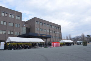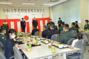 西部方面システム通信群(群長 兼子 孝人1佐)創隊63周年記念行事は、令和5年2月18日(土)足元における感染者数は減少傾向にありつつも、未だ規模を縮小した形での実施となりました。まず健軍駐屯地で開かれた協力会総会の場において、(有)浩之勗 丸山氏に対して群長より感謝状が贈呈されました。そして総監部前儀仗広場において、木原衆議院議員代理 太田氏、松村県議会議員、歴代群長等ご列席の下、厳粛な式典が挙行されました。式典の後には優秀隊員に対する顕彰式が、ご家族を交えての和やかな昼食会とともに開かれました。また、来賓に対する器材展示も行われました。その後、部外に会場を移した3年ぶりとなる祝賀会が開催され、部隊の益々の発展と隊員の活躍を祈念した盛大な万歳でお開きとなりました。