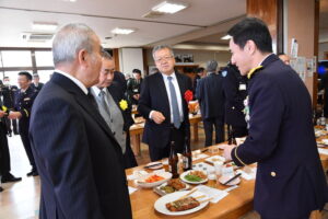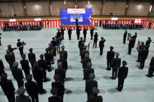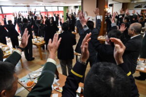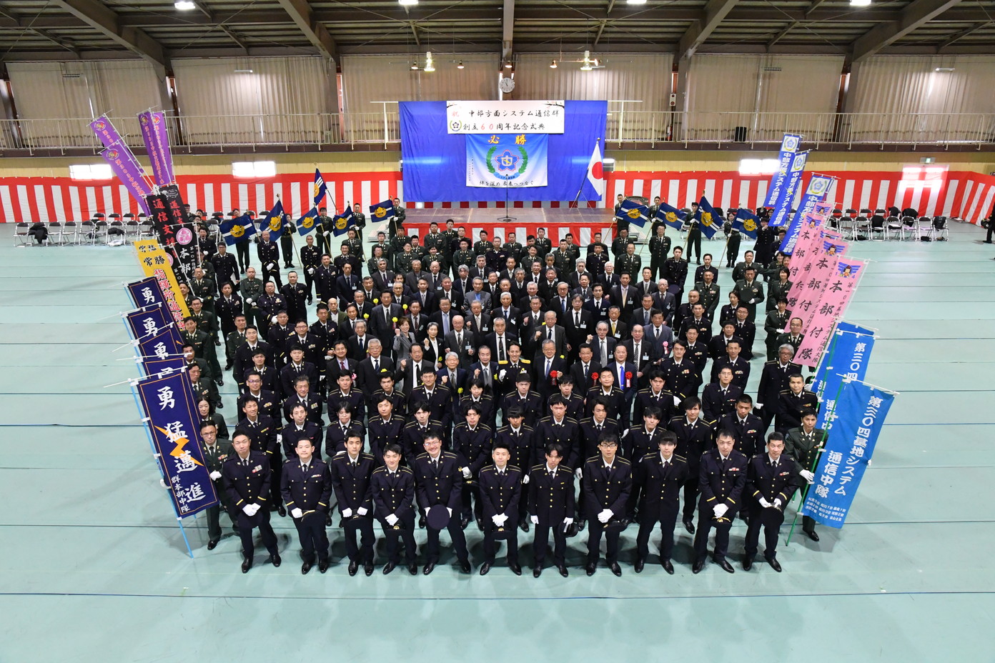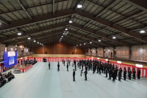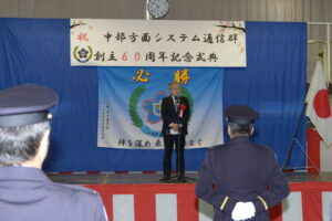 中部方面システム通信群(群長 竹永 竜也1佐)創立60周年記念行事は、令和5年3月4日(土)足元における感染者数の減少を受けて、若干ながら規模を拡大して実施されました。まず伊丹駐屯地体育館において、歴代群長(第24代秋山氏、第26代梅田氏等)臨席の元、厳粛な記念式典が執り行われました。成田信友会会長も第21代群長として、創立60周年を祝う言葉を述べさせていただきました。その後、隊内クラブにおいて実に3年ぶりとなる祝賀会が開催され、鏡割りや立席ならではの活発な懇談等、60周年という節目の年に相応しい華やかな会となりました。そして、部隊の益々の発展と隊員の活躍を祈念した盛大な万歳でお開きとなりました。