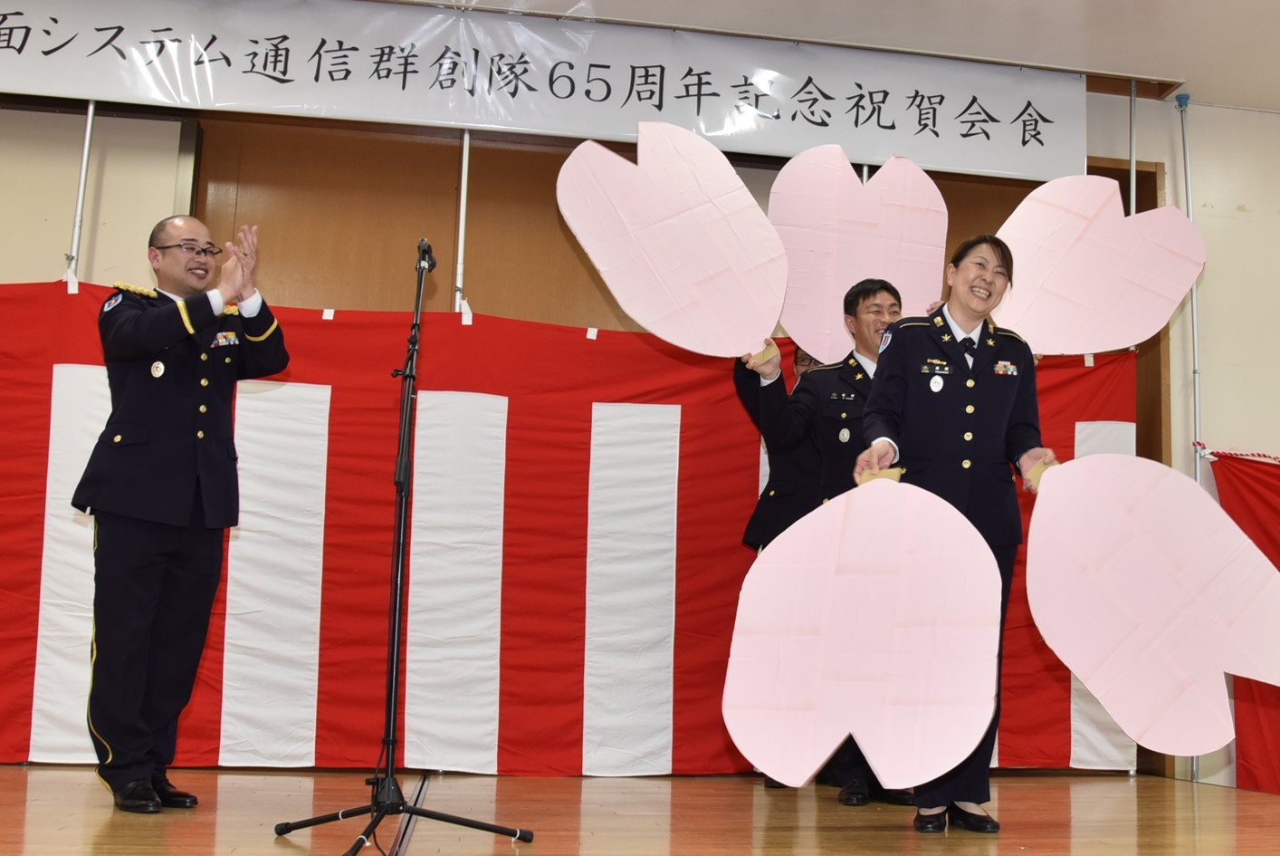 令和7年4月12日(土)、「東北方面システム通信群(群長 下平隆晴1佐)創隊65周年記念行事」が、歴代群長はじめ、協力会・OB会長以下会員、多くの部内外来賓をお迎えして、桜が満開となった仙台駐屯地において執り行われました。 群記念行事は、駐屯地体育館において「記念イベント(65年の歩みビデオ・格闘展示・マジック等)」が行われ、続いて隊員食堂において、「祝賀会食」が盛大な中にも和やかな雰囲気の下に行われました。 また、群のご協力のもと、東北地区信友会員及び信友会長以下役員等15名をもって、「信友会東北地区懇親会」を開催して、会員相互の懇親を図ることができました。 ※掲載の写真は、東北方面システム通信群より提供いただきました。 |